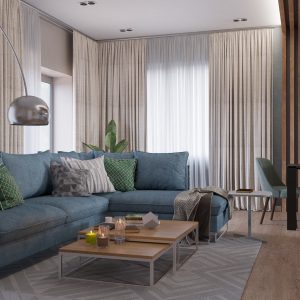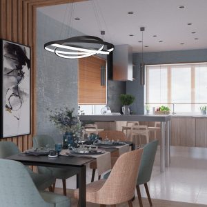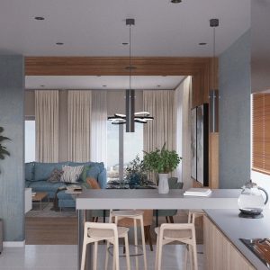 Кухня-гостиная в загородном доме п. Шмидтово, напольные покрытия-паркет,зона кухни-керамогранит. Отделка стен-декоративная штукатурка и покраска,также выбраны рейки,для разделения зон.