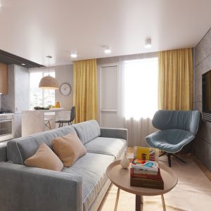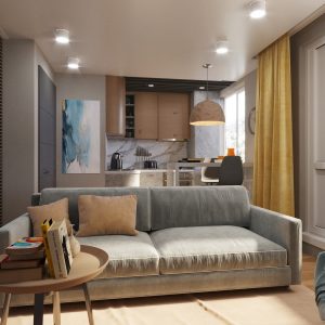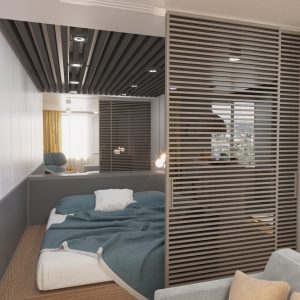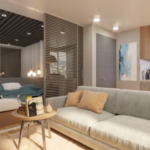 Квартира-студия выполнена в современном стиле, санузел-плитка из коллекции керама марацци. кухня-гостиная -однотонные обои,ламинат,керамогранит,3д панели,рейки,раздвижные двери для разделения зон